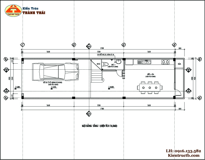 – Diện tích xây dựng là: 76,5m2 (kích thước tổng ngôi nhà là 4,5mx17m)