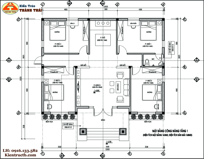 – Diện tích xây dựng là: 143m2 (kích thước tổng ngôi nhà là 13mx13m)
