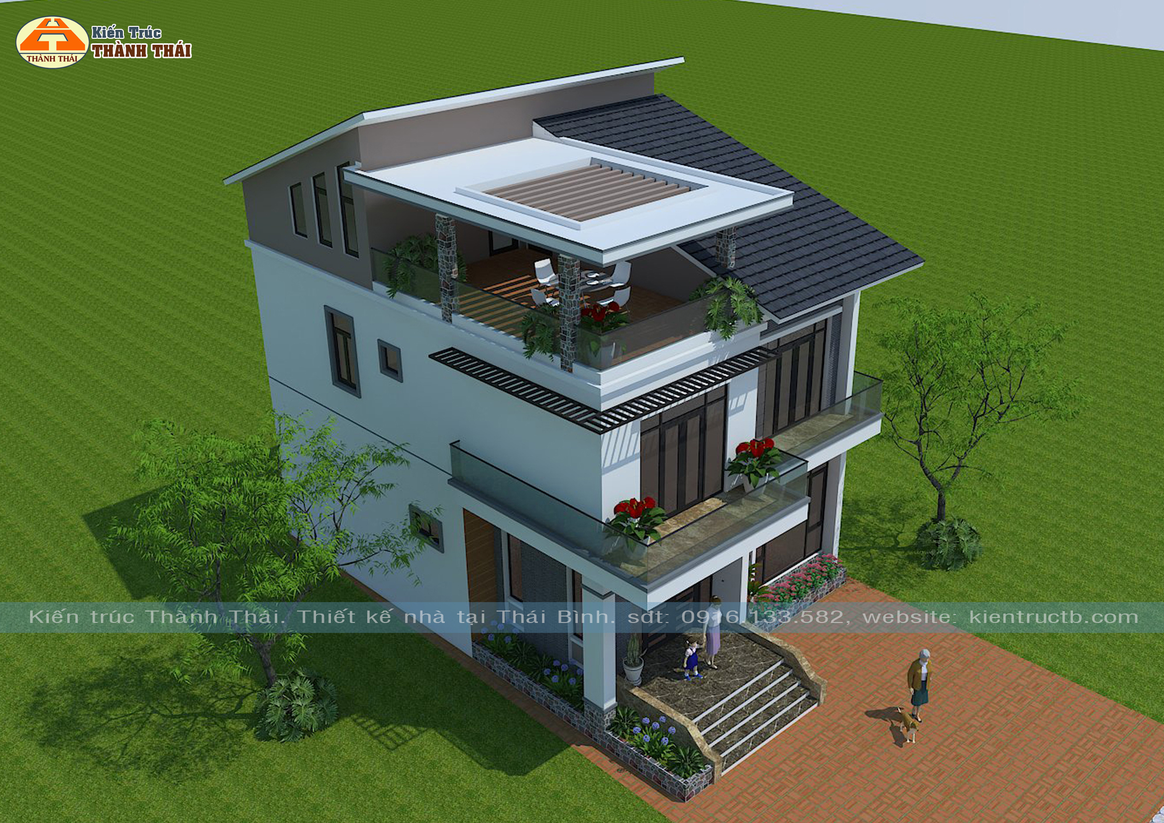 – Kiến trúc theo phong cách thiết kế biệt thự dạng mái lệch hiện đại.
