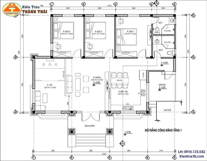 – Công năng tầng 1 bao gồm: 3 phòng ngủ (trong đó có 1 phòng khép kín); 1 phòng thờ; 1 phòng khách; 1 bếp + ăn và 1 khu vệ sinh chung