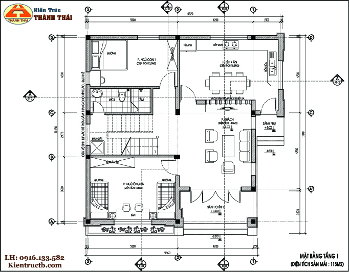 – Diện tích xây dựng là: 115m2 (kích thước tổng của nhà là 11mx11m)
