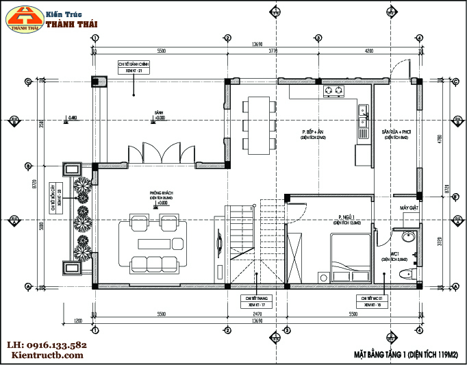 – Diện tích xây dựng là: 119m2 (kích thước tổng của nhà là 9mx15m)