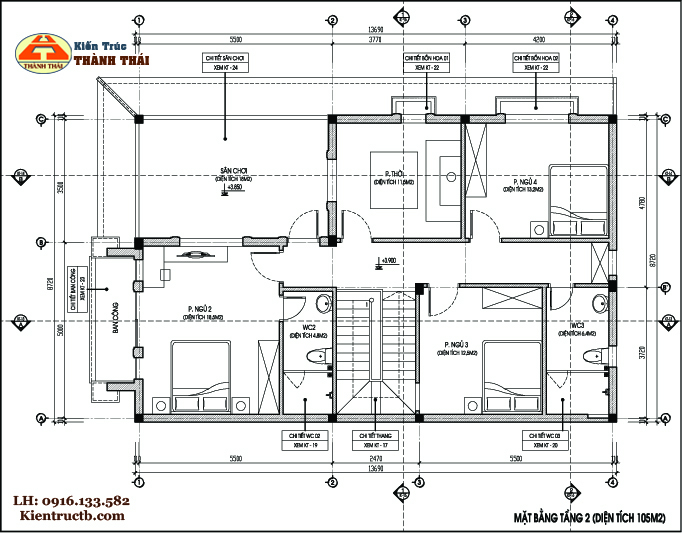 + tầng 2 bao gồm: 3 phòng ngủ (trong đó có 1 phòng khép kín); 1 phòng thờ; 1 sân chơi rộng và 1 khu vệ sinh chung.