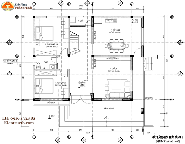 + tầng 1 bao gồm: hai phòng ngủ có diện tích 12,6m2 và 16,5m2; một phòng khách có diện tích 33,5m2; một bếp + ăn có diện tích 23,5m2 và một khu vệ sinh chung