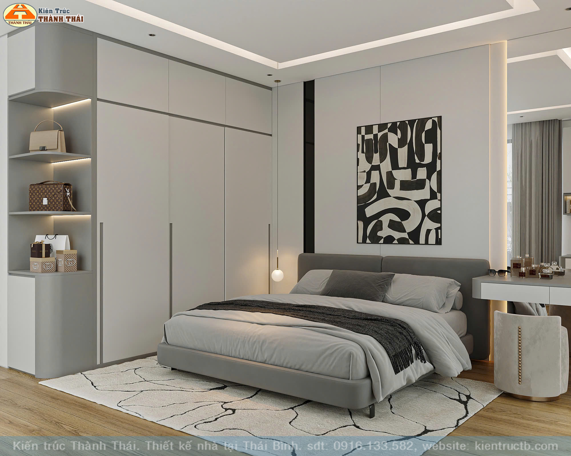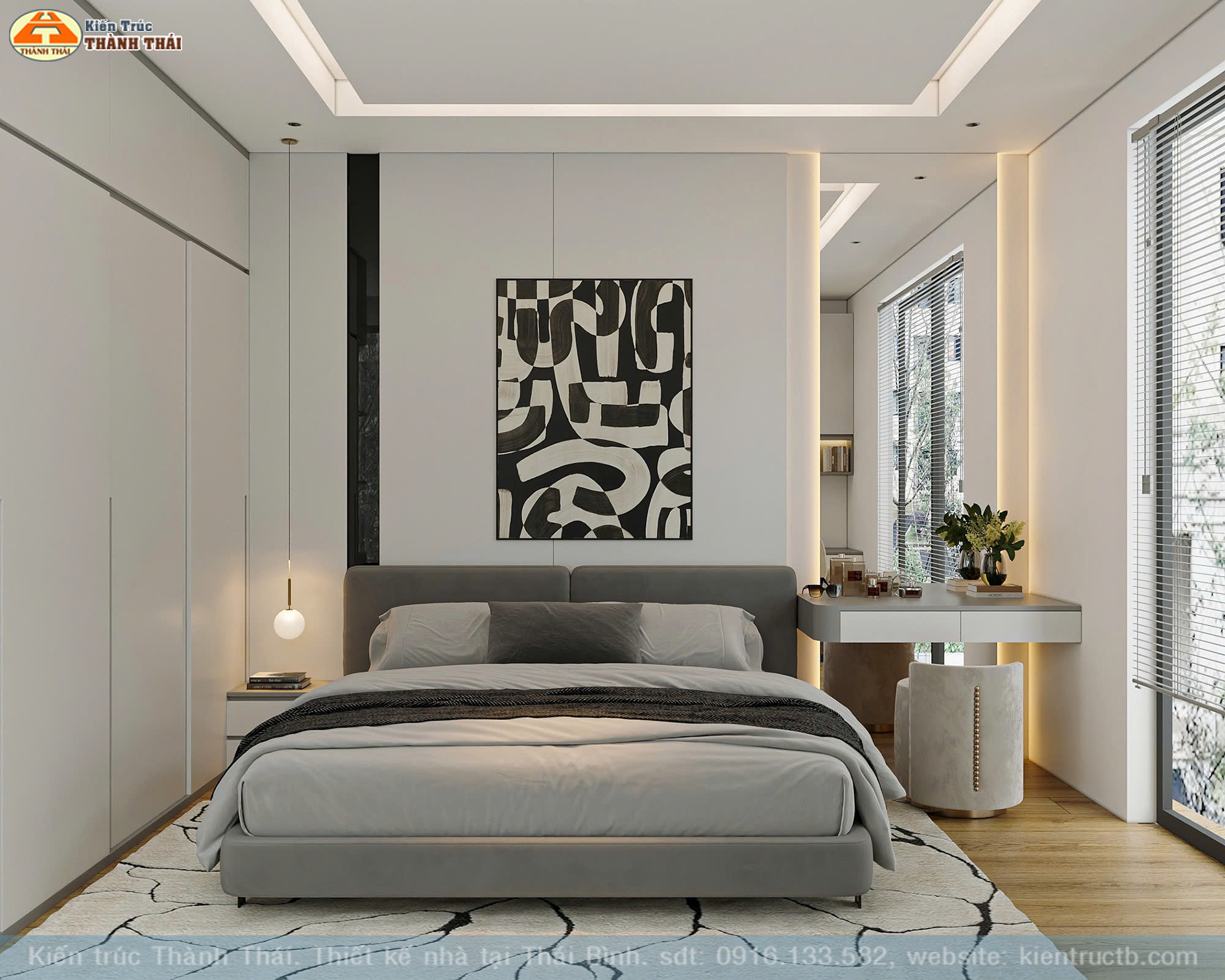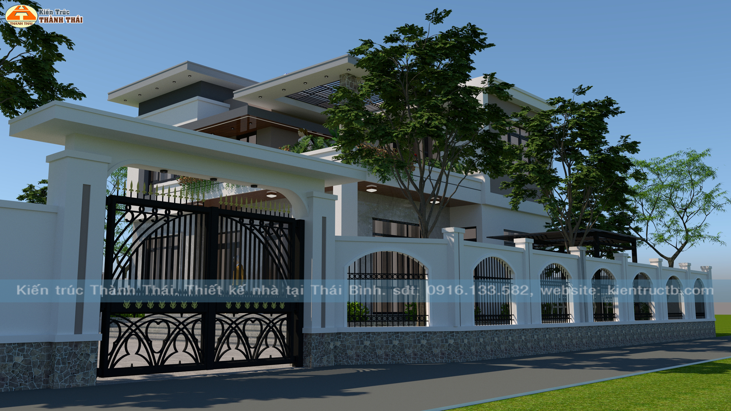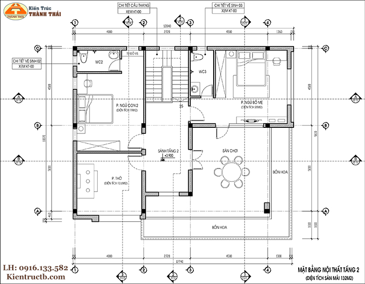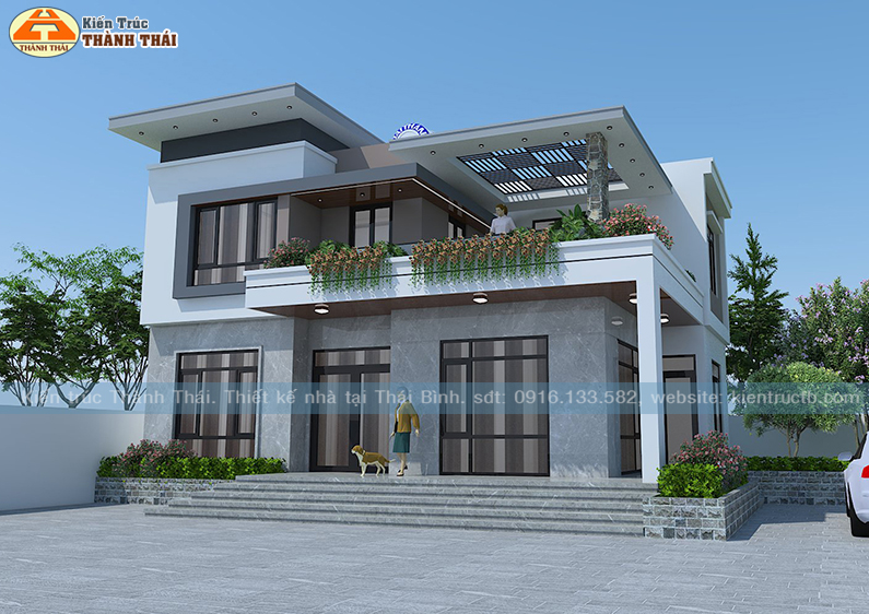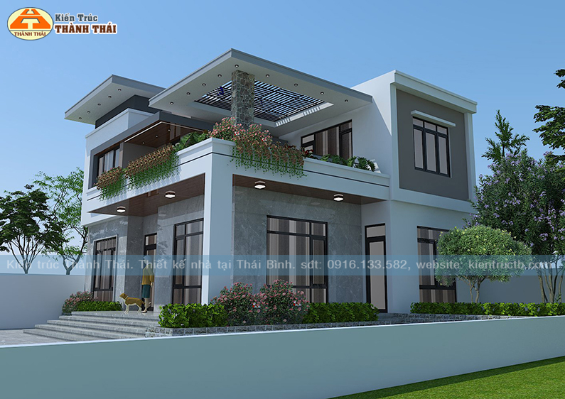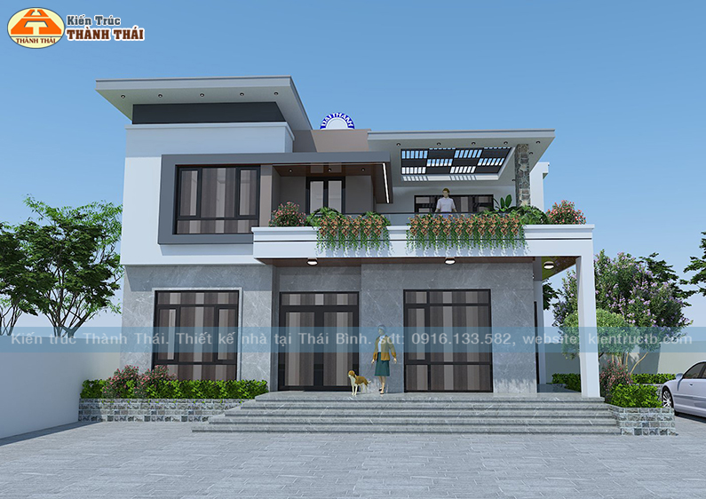+ tầng 2 bao gồm: hai phòng phòng ngủ khép kín có diện tích lần lượt là 19m2 và 20m2; một phòng thờ; sảnh tầng và một sân chơi rộng phía trước.